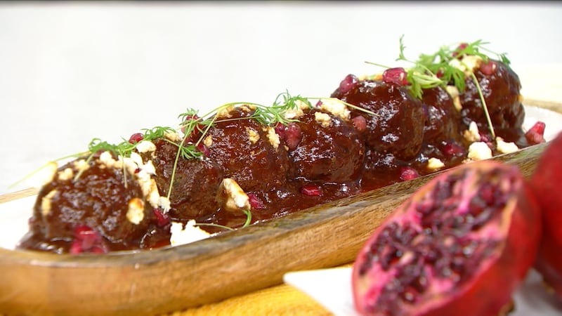 - Once meatballs are braised and tender, garnish with fresh pomegranate seeds, feta and fresh herbs.