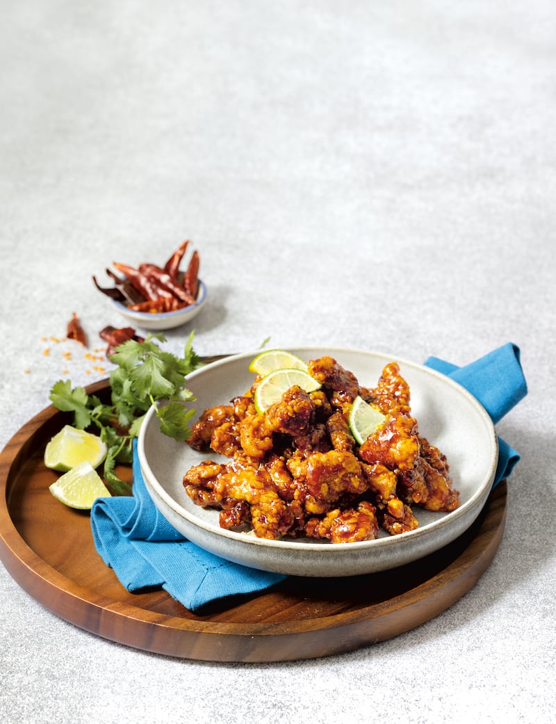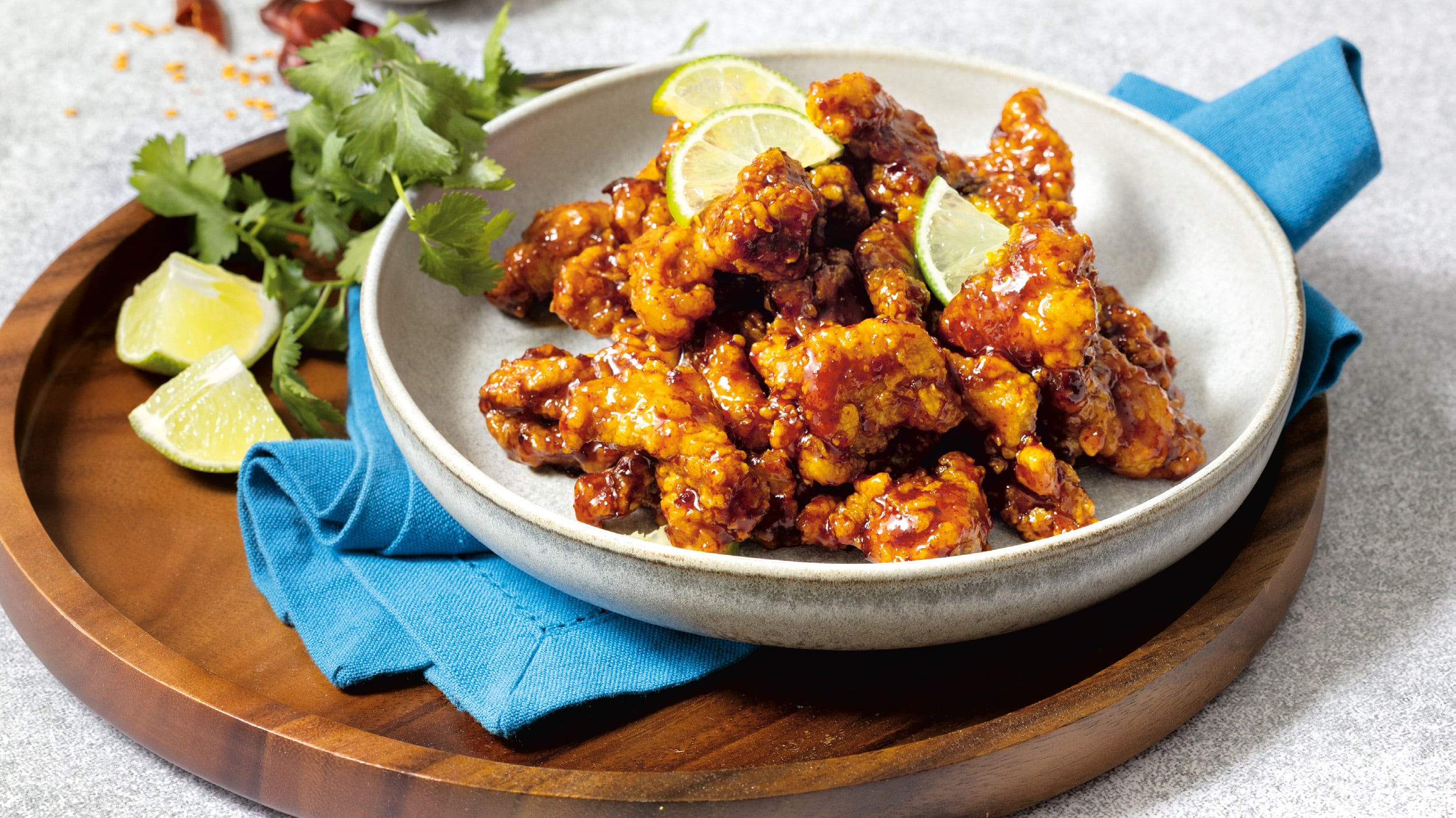 In a medium pot or wok, heat about 2 inches (5 cm) of neutral oil over medium-high heat to 375°F (190°C). Line a plate with paper towel. Grab one piece of chicken at a time with tongs, shake off any loose flour, then place it into the oil. Be careful not to overcrowd the pot; you’ll need to fry in two or three batches. Fry for 2 1/2–3 minutes until the chicken is golden brown, then remove and drain on the paper towel.