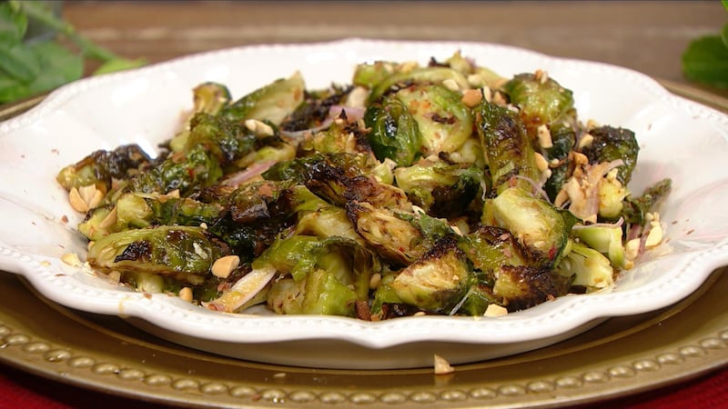Toss the Brussels sprouts with the dressing and cilantro leaves and transfer to a plate with a bit of depth to catch the dressing. Don’t use a deep bowl for serving or the dressing will pool and soak the bottom pieces. Sprinkle with roasted peanuts and serve warm or at room temperature.