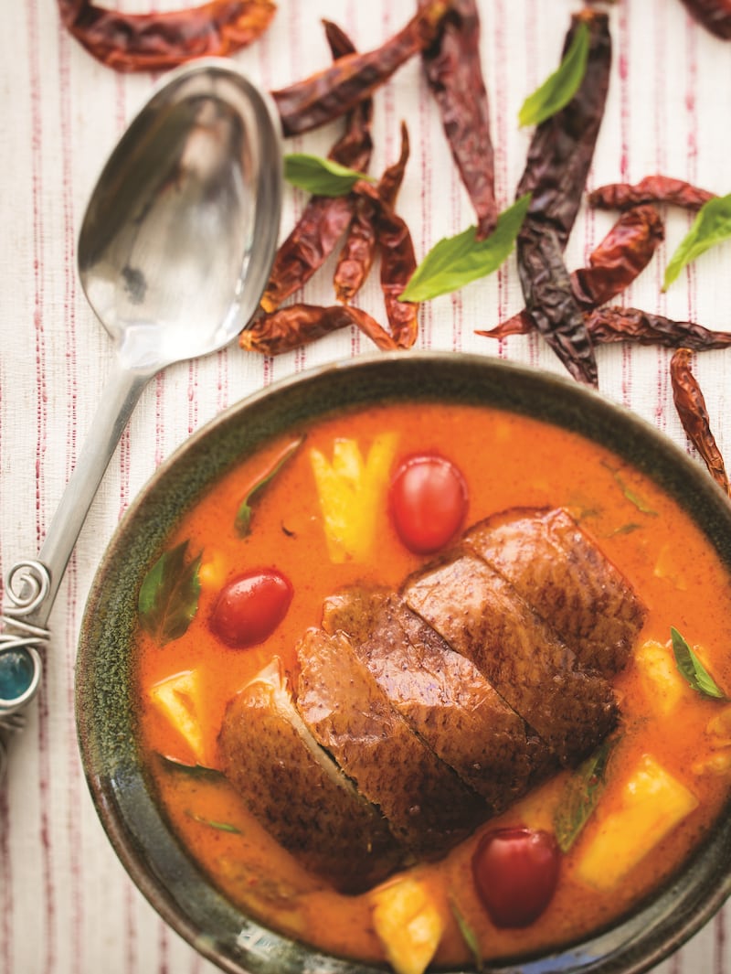When the curry boils, add the duck meat and pineapple, then simmer gently for 3–4 minutes so they absorb the curry (if you cannot fit all the duck meat into the pot, set the extra aside for later). While the curry simmers, pierce the grape tomatoes with the tip of a paring knife (if the tomatoes don’t split naturally, this incision releases the built-up pressure so they won’t explode in your mouth when you eat them!).