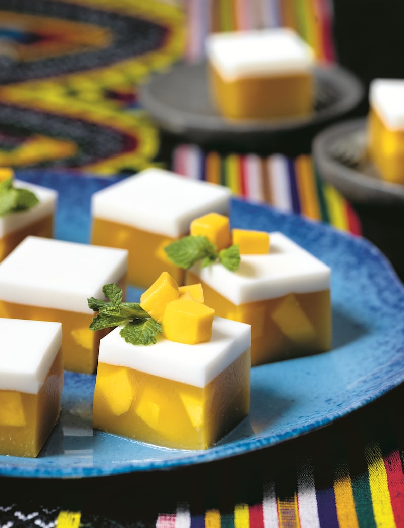 Add the sugar, salt, and coconut milk and stir until the sugar is dissolved. Remove from the heat and, while still piping hot, gently pour the coconut layer over the back of a spoon onto the mango base, moving the spoon around as you pour so you don’t create too much pressure in one spot. (If you pour too aggressively, it could break the mango layer, especially if the mango is not fully set.) Allow to set at room temperature, then refrigerate for a few hours until cold.