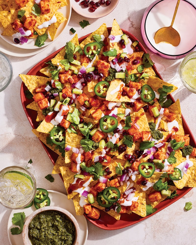 Drizzle the tamarind chutney and mint chutney overtop, and garnish with the red onion, cucumber, pomegranate seeds, jalapeño, and fresh coriander. Lastly, sprinkle on the remaining ½ Tbsp chaat masala and ½ tsp chili powder.