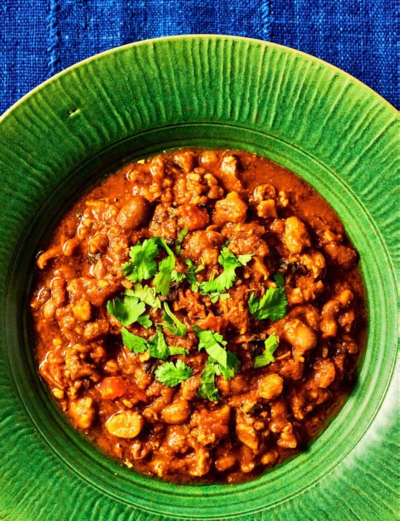 Add the mashed fava beans, xawaash, and salt to the pot; stir to combine and cook for 1 minute, then add the cilan-tro, water, and tomato sauce. Cover the pan, turn the heat to medium-low, and simmer for about 15 minutes, stirring occasionally, until the beans and tomatoes have incorpo-rated into a thick stew. Add a bit of water if you find that the fuul has gotten too thick, and serve.