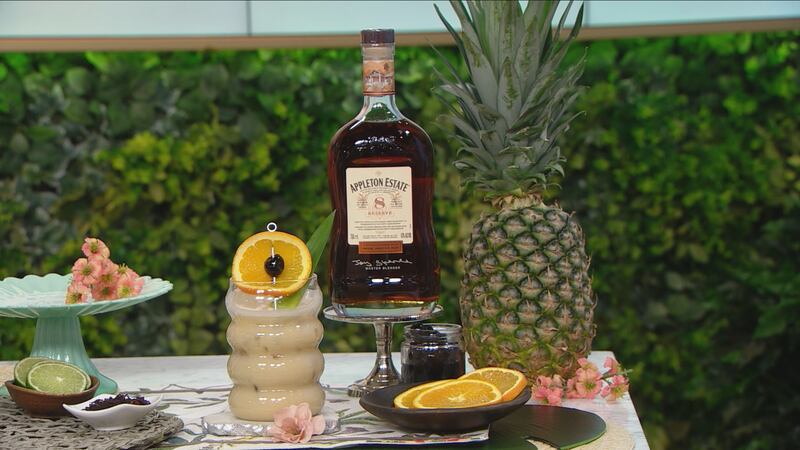 - Top with crushed ice and garnish with freshly grated nutmeg, a cherry, pineapple wedge and pineapple frond.